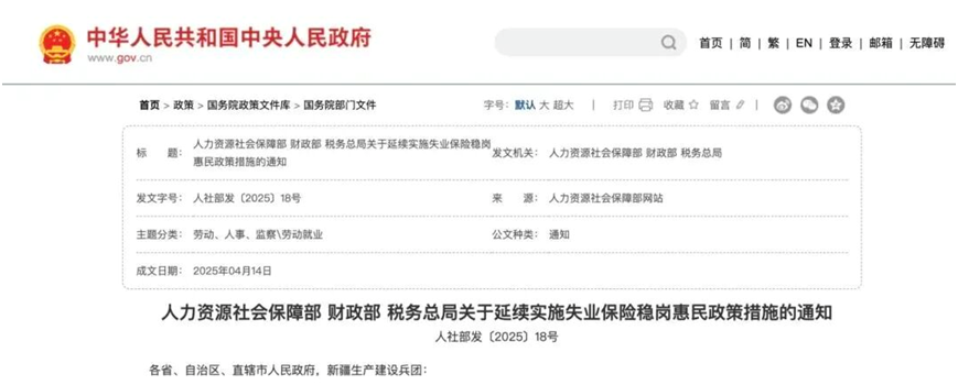 今年4月,人社部、财政部、税务总局联合发布《关于延续实施失业保险稳岗惠民政策措施的通知》,该项政策的实施期限将在2025年12月31日截止。
